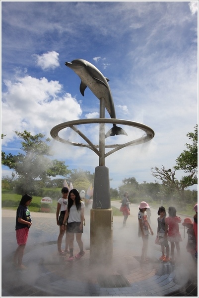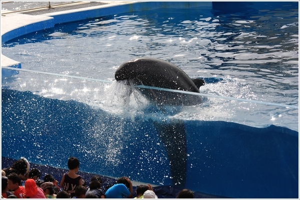 半個小時的表演在歡樂的配樂中結束,結束前特地把孩子們集中到海豚前噴得一身涼快!