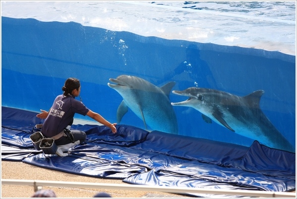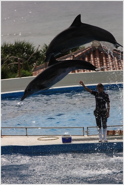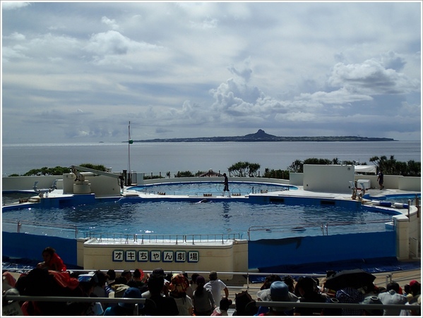輕輕鬆鬆走完海牛和海龜館,接著到旁邊的海豚劇場看今天最後一場四點的海豚表演。對面是五月會開滿美麗百合花的伊江島。
