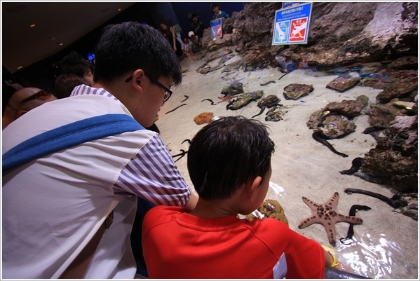 入口的觸摸池,圍了一群小朋友可以近身接觸。