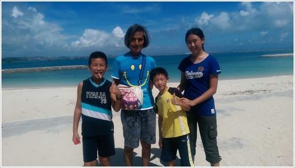 日本對遊覽車司機行駛時數有安全限制不得超時駕駛。為了配合我們晚上看煙火,所以今天中午才開始行程。早上就收拾行李準備換飯店,終於可以好好享受一頓飯店的早餐(第一天浮潛,第二天單車都很早就出門),帶著二代做的手舉牌在沙灘好好拍各種團體照。