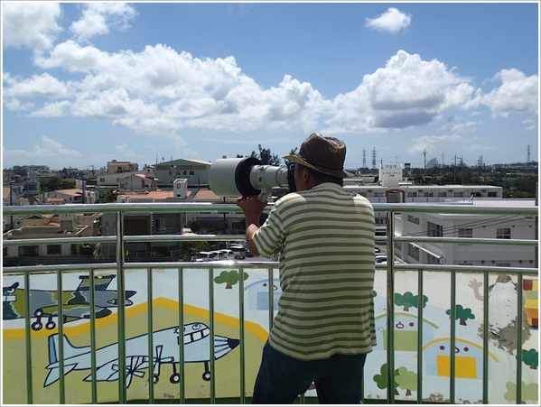 小小的電梯帶大家到頂樓的觀景台,這兒早已坐了一大票追機者,個個看起來像是鄰家阿伯的長者,大砲一隻比一隻大真是壯觀。